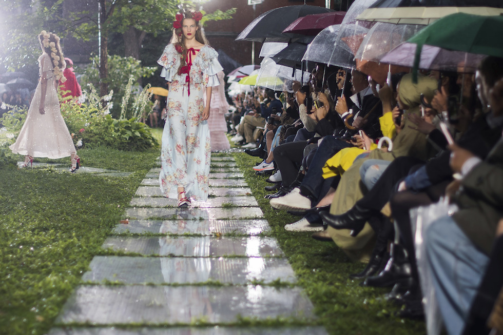 Le modelle di Rodarte, che hanno sfilato sotto la pioggia mentre il pubblico si riparava sotto gli ombrelli, New York, 9 settembre 2018